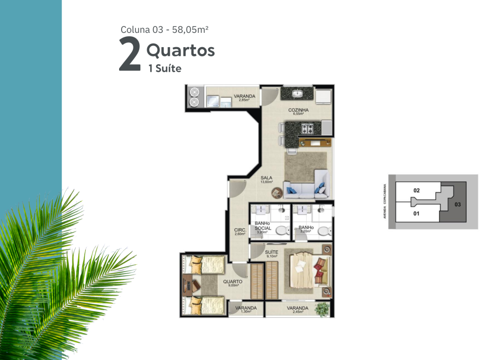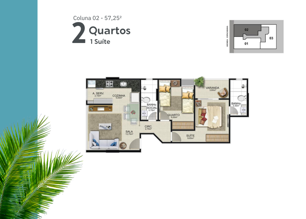 – 02 quartos, sendo 01 suíte, com plantas funcionais e acabamentos de alto padrão.